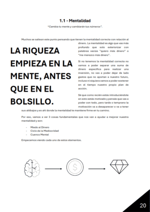Parte de la base, que es una mentalidad sólida alineada con el dinero y la generación de riqueza, para luego mostrarte de manera práctica todo lo que tienes que hacer, llegando incluso a cuestiones muy avanzadas como multiplicación del dinero, impuestos y protección de capital, explicadas de manera simple para que no te pierdas nada y puedas aplicar todo.